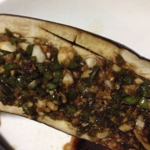 辣椒,大蒜切碎,放入生抽,茄子切开