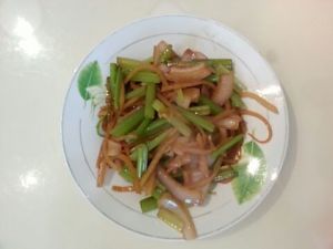 油锅烧热,依次放入姜,葱,土豆丝(切记不可切的太细),洋葱翻炒,一分钟后放入芹菜,加入少许酱油,醋,盐,继续翻炒,出锅装盘。