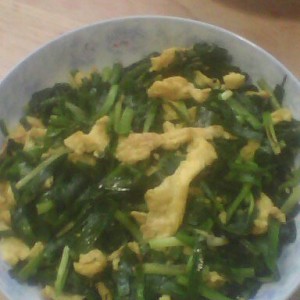 锅里倒少许油,6成热时倒入姜丝炒出香味,把韭菜倒入大火翻炒,调入盐。生抽