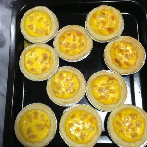 最后将切丁好的芒果均勻分配至装好挞液的蛋挞皮中(芒果量依据个人口味调配),送入烤箱中上下管210°,20mins。