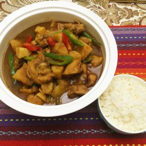 油热下花椒小火炸香, 捞出花椒,加冰糖小火炒糖色,炒到冰糖全部融化,加鸡肉块大火翻炒,加葱姜蒜,倒入土豆翻炒;倒入老抽,生抽,盐,加水中小火炖半个小时;