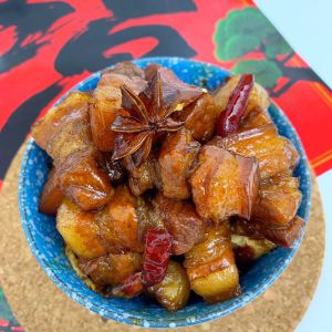 加糖炒变色;将葱姜、八角、干辣椒爆香,翻炒五花肉(炒出多余的油脂)。