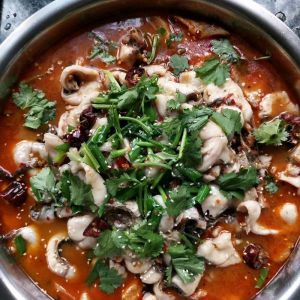 锅烧热,下油,葱、姜爆香,入鱼头翻炒后加清水、盐、糖、鸡精、料酒,烧开再加鱼肉(不可烧久以免鱼肉变老不嫩)大家红、花椒、干红椒、烧开后洒上熟芝麻,整锅倒入原先装好土豆等的大盆中。另起锅油烧热淋入盆中,洒上葱花及香菜。
