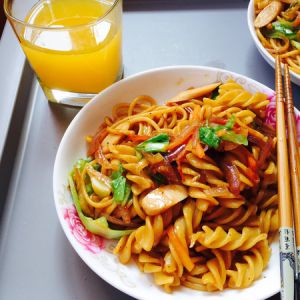 炒锅加油,倒入配菜翻炒至变色加入面小火翻炒