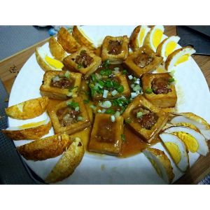 豆腐装盘,水煮蛋过油炸成虎皮鸡蛋,切开摆盘,锅内在加少许水,耗油,盐大火煮开,水淀粉勾芡,淋汁,撒上葱末这样就做好了!