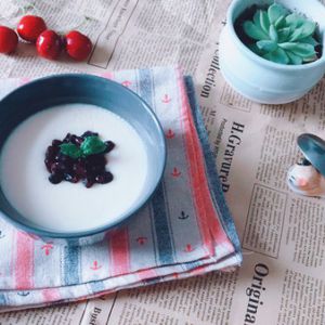 将放凉的双皮奶放入冰箱冷藏,将冷藏好的放上蜜小豆装饰