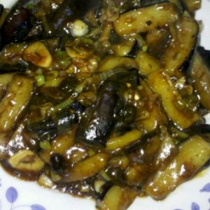 倒入爆香的葱姜蒜中,小火煎至水淀粉变成糊状,倒入炸好的茄条,翻炒均匀即可出锅。