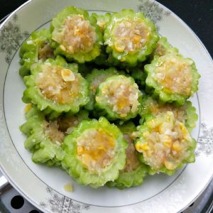 将肉均匀的塞入苦瓜,可用小勺子压平