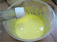 蛋黄用打蛋器一边打一边加色拉油搅打成厚糊状。
