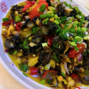 锅里放油,多点,花椒,姜蒜青红辣椒爆香,下田螺肉,因为自带了些水分不要放水,收汁后放佐料