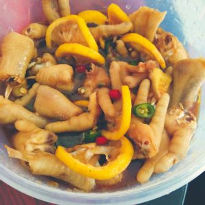 调汁 柠檬用盐搓洗 切片 去籽 怕苦的可以去皮 百香果加入 所有辣椒切小段 香菜切段 蒜瓣拍碎 盐 鸡精 糖 米醋 香醋 生抽 雪碧 加入尝味缺啥加啥 汤的味要重一点 清了鸡爪没味(上面有写加多少 我不爱吃蒜和香菜就没放)