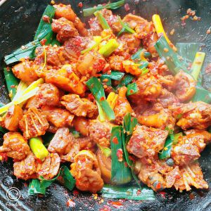 不停翻炒,让金龙鱼葵花油逼出鸡块的水分,慢慢翻炒至鸡肉水收干,盛出鸡块