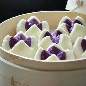 取100g紫薯泥,15g糖,100g面粉,2g酵母,5g温水(根据量加)