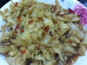 放入两勺醋,一勺生抽,两勺剁椒,翻炒