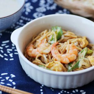 放入面条及时翻动以免糊锅,可烹入少许水,加入鸡蛋、虾仁
