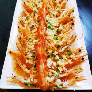 盘底码粉丝,把虾铺上去,再把蒜蓉酱铺在虾的表面,大火烧开水后,大概火蒸5分钟出炉浇一点热油。