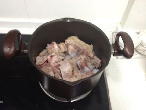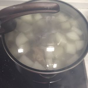 倒入凉水没过排骨再加半个手指,大火煮开,捞去浮沫,加入干贝,切小块去皮的莲藕和白萝卜小火炖,一个小时以后加入盐调味,再小火煮二十分钟