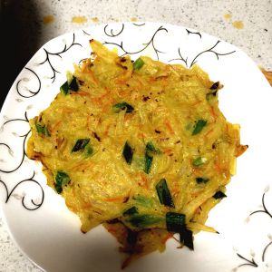 土豆胡萝卜擦丝 香菜切段 加入两个笨鸡蛋 面粉两大勺 盐适量 充分搅拌