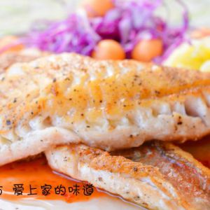 在鱼身上撒少量干面粉,拍掉多余面粉,煎锅烧热加入黄油,放入海鱼煎烤到两面变黄装盘食用