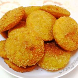 油温五成热下南瓜饼炸制,火不要太大,油温高面包糠炸糊了里面还不熟。