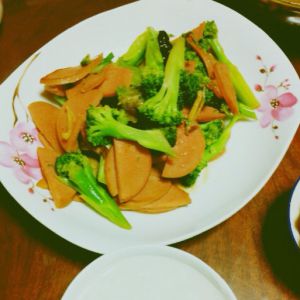 放入火腿和西兰花翻炒,放入盐和豆瓣酱