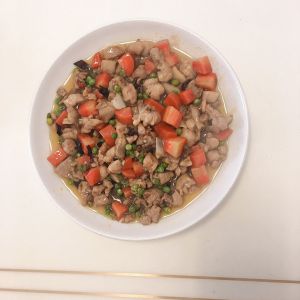 黄瓜胡萝卜切丁,嫩豌豆,水开一起放进锅里煮熟备用
