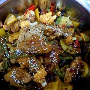 关火,洒白芝麻点缀,出锅。香喷喷的麻辣香锅鸡翅。