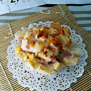 好吧,刚说不要切断,就被切断了,只好用锡纸包包,回正题,在格子缝隙塞上满满的芝士玉米火腿。