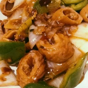 青椒,洋葱,肠头改刀如图,其中取2片洋葱切末。提前准备好芡汁,包括生抽,豆瓣酱,胡椒粉,料酒,淀粉,糖,水。