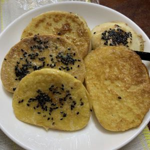 5,二次裹上蛋液,加入适量黑芝麻,煎至金黄色,起锅装盘。