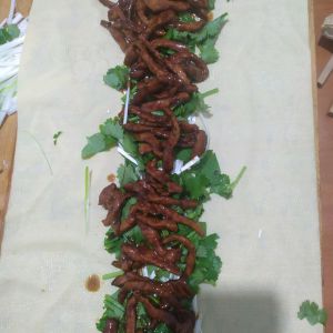 我为了省事,直接一大张豆皮上面铺的葱丝,香菜,肉放上去后,淋一些甜面酱汤比较入味哦!