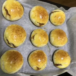 分切成29g的小面团若干个,擀成中间厚的圆形,馅料放少一些,因为放太多烤的时候会裂开。包好,全排上烤盘,用保鲜膜包裹着15分钟,200度预热烤箱,撒开保鲜膜包子涂上蛋黄液,将温度调为180度,中层,烤20分钟。中途再涂一层蜂蜜。即可