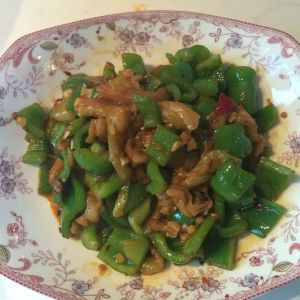 翻炒至青椒断生,倒入调好的汁儿,翻炒几下。