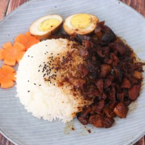 准备食材。猪肉切成小块,鸡蛋提前煮熟备用,香菇提前泡发,洋葱切小粒。