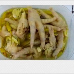 小锅水,放小块姜,煮开水后放入凤爪,大概煮七八分钟,出锅,放入凉开水中冷却。