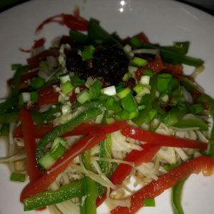 青,红椒,切丝,和金针菇一样做法,撩完水放入盘子