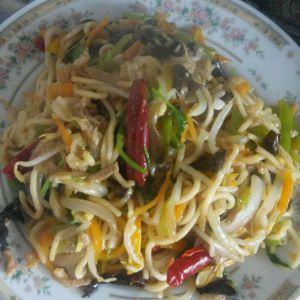锅里倒油,放入葱姜蒜,这些食材里没有写,先把肉丝炒熟,再放入红椒和蔬菜,这时放入准备好的豆瓣酱,炒出香味,就可以放入面条了,不断地翻炒吧