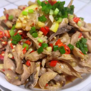 鸡腿划开口子,凉水下锅,煮熟后,凉白开里过一下(收紧肉质),繁复几次觉得不太烫了,就手撕鸡腿肉,撕成条