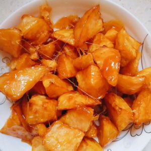 将炸好的地瓜放入炒好糖的锅中快速翻炒,然后出锅(也可以将炒好的糖淋在炸好的地瓜上),就可以拔丝了
