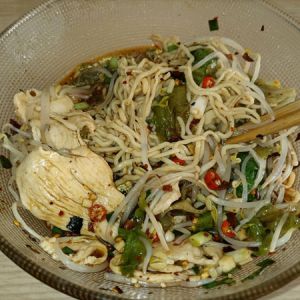小碗中放入小米椒沫、蒜末、一勺酱油、2勺醋、一勺蚝油、适量胡辣椒、花椒油。热锅烧橄榄油,油热后泼在蘸料上搅拌。