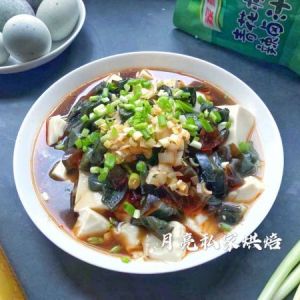 碗中倒入切好的葱末,香醋1匙,味极鲜1匙,芝麻油6滴,辣椒油1匙,2匙白凉水搅拌均匀后浇在盛有切好的松花蛋丁的表面,撒上提前切好的香葱末点缀一下即可食用。松花蛋拌嫩豆腐必须用香醋和味极鲜,用其他种类的醋和酱油拌出的松花蛋拌嫩豆腐不如用香醋和味极鲜拌出的好吃,喜欢姜的可以在调酱汁的时候加点姜末进去。
