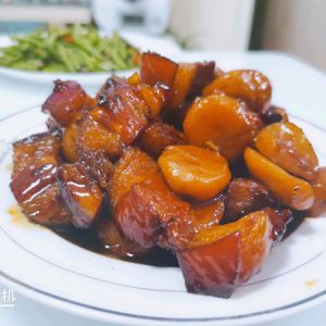 准备好原料,把五花肉设成大块,生姜切片,板栗洗干净备用