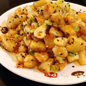 平底锅加热倒入少许油,倒入土豆粒煎至表面金黄