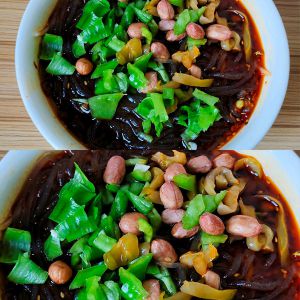 倒入调好料汁的碗里,加入青椒,花生米,榨菜丝,搅拌均匀即刻食用