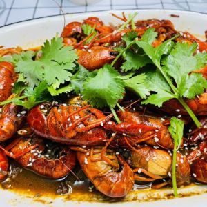 料炒香后加入龙虾,继续大火煸炒一分钟