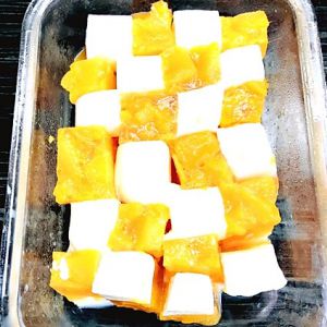 芒果丁倒入刚才已经放凉的牛奶冻上,放冰箱冷藏2-3小时