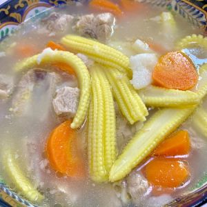 先放入胡萝卜和山药,小火炖至软烂,15分钟左右后加入玉米笋,再炖上5分钟,出锅前加少许盐调味