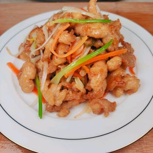 料汁起泡,粘稠的时候在下入炸好的肉片,和另一半的葱丝