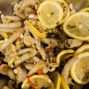 鸡爪切开冷水下锅,加姜片,葱段,料酒煮十分钟。