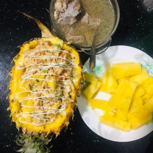 炒饭的步骤忘记拍照了,油锅加入洋葱蒜头煸香后胡萝卜切丁炒熟,再煎鸡蛋,加入干饭和适量的油蛤汤和酱油,把成团的干饭炒散,最后加入油蛤和几块菠萝果肉炒一炒即可出锅用菠萝槽盛装